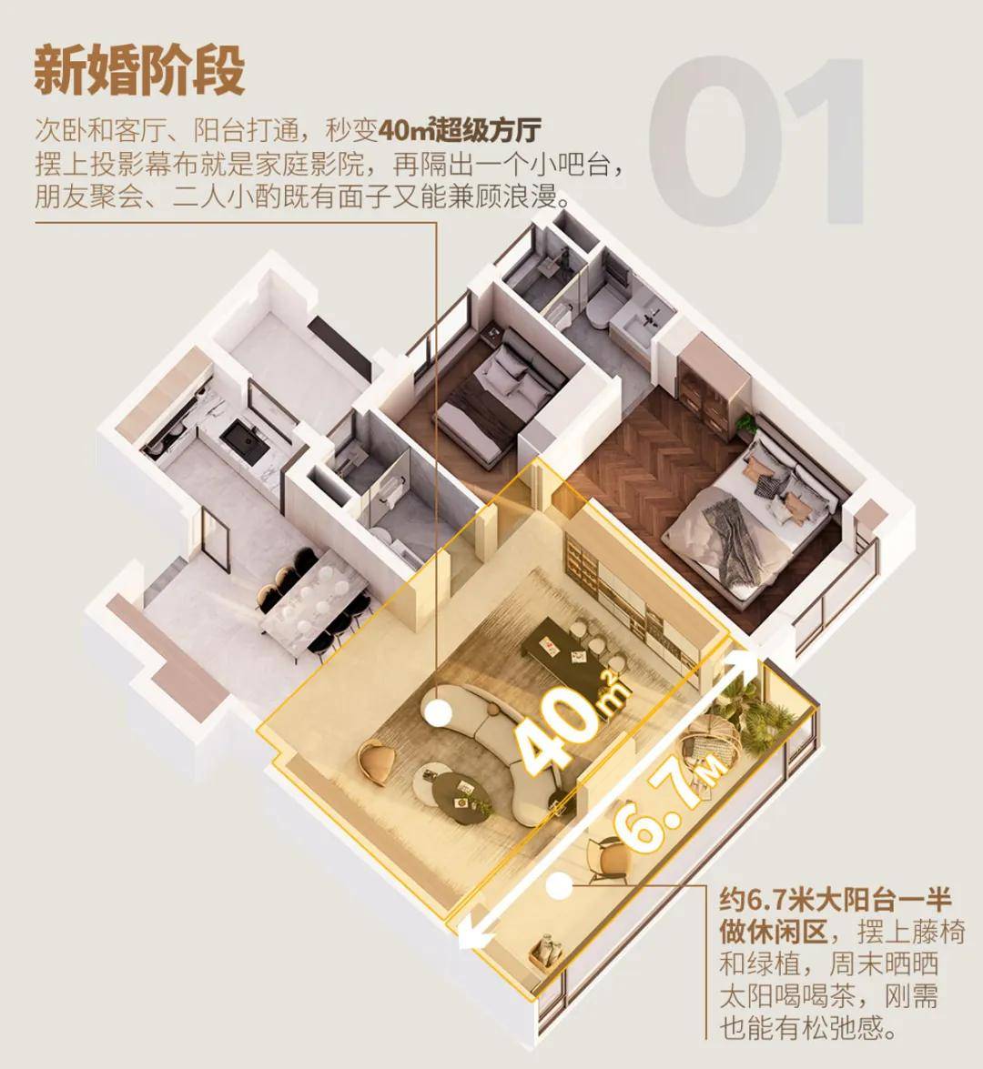 新婚阶段——把次卧和客厅、阳台打通,秒变40㎡超级方厅,摆上投影幕布就是家庭影院,再隔出一个小吧台,朋友聚会、二人小酌既有面子又能兼顾浪漫。