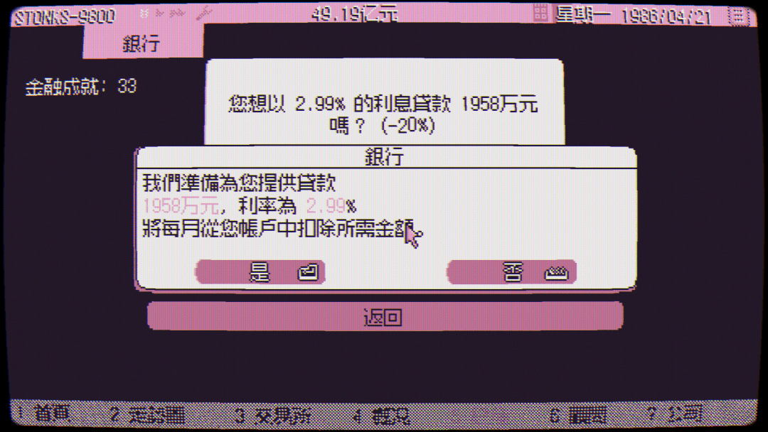 《东京股神 STONKS-9800》Steam测评区的玩家讨论中总会出现这样的论调:游戏里赚钱有点太简单了,只需要多贷款一些就能立马多赚几番,钱都不知道怎么花。但这恰恰就是那个黄金年代的真实写照,当钱生钱变得极简而低风险时,大多数人宁愿背债也要贷款投资。